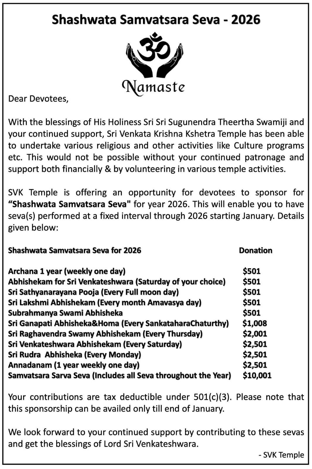 We are a 501 (C) (3) organization and your donations are tax deductible. Please keep SVK Temple in your mind as you finalize your year-end taxes. SVK Temple is here for all your needs. Please contact us if you have any questions.