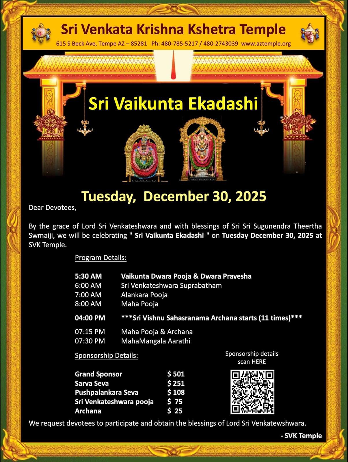 SVK Temple will be celebrating Sri Vaikunta Ekadashi on Tuesday, December 30, 2025. Please find the program and sponsorship details below.